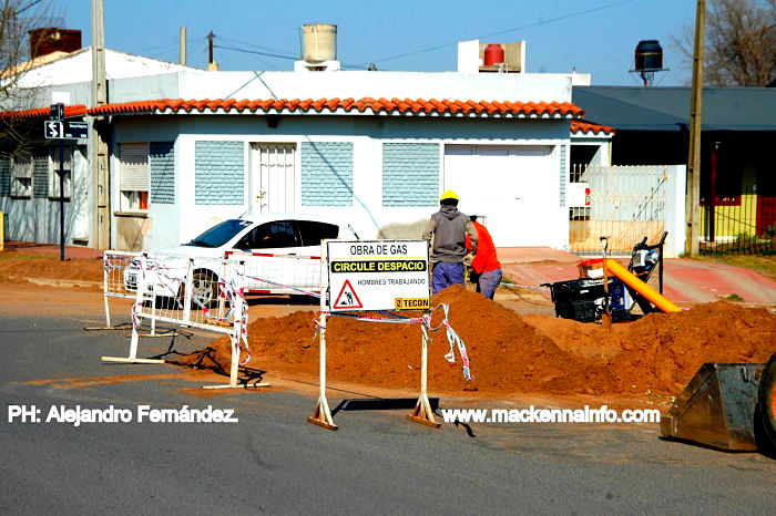 La esperada y vital obra de gas, tantas veces prometida, finalmente ya es una realidad para los habitantes de Mackenna. La empresa Tecon Constructora, ganadora de la licitación, esta en plena ejecución de los primeros 4500 metros de cañería troncal y red domiciliaria que es subsidiada por la empresa ECOGAS tras un acuerdo con el gobierno provincial.