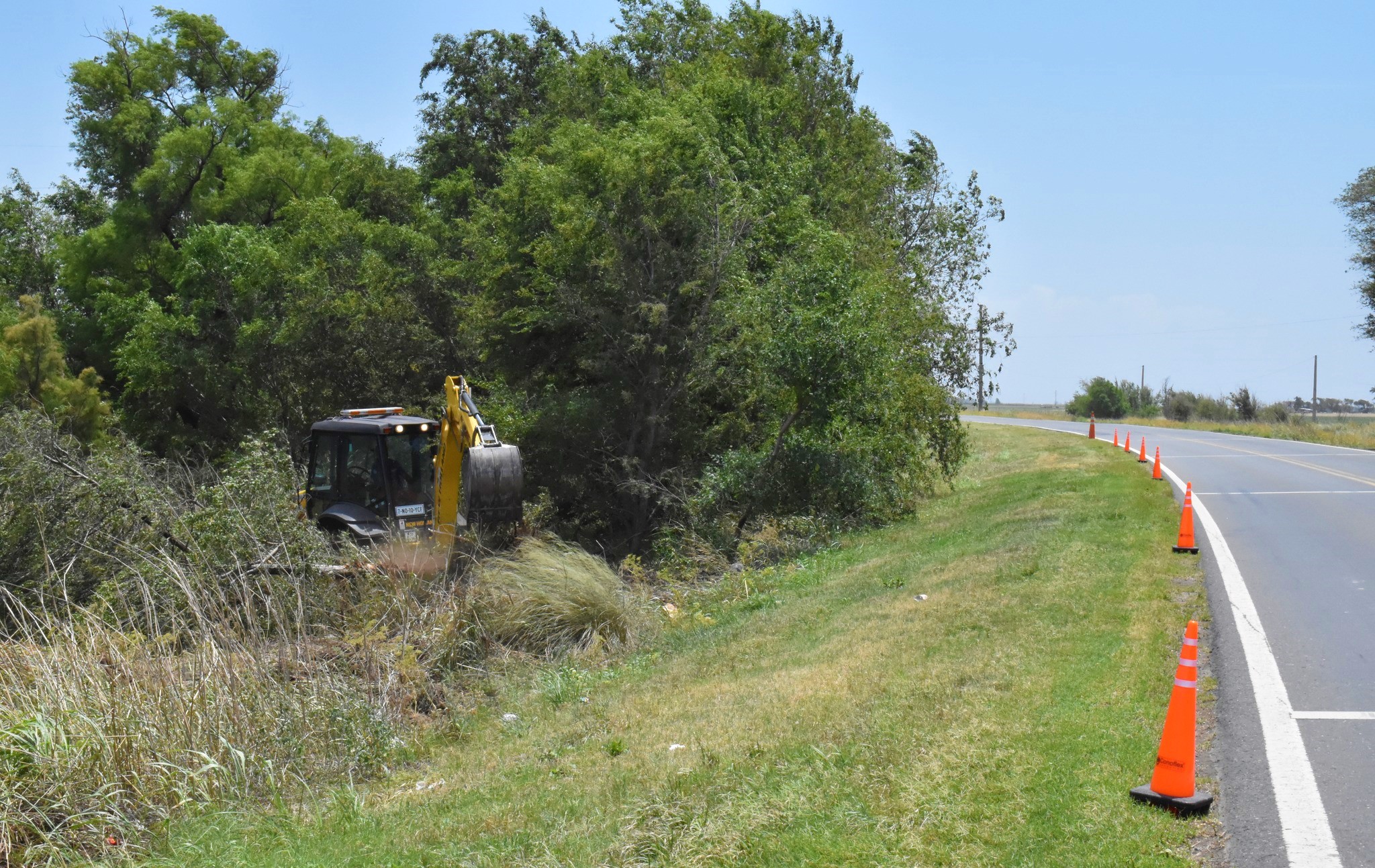 Por pedido de la Municipalidad y en un trabajo conjunto con Vialidad Nacional, se realizó el desmalezado y limpieza de plantas a la vera de la Ruta Nacional N° 35, antes del cruce del Ferrocarril.