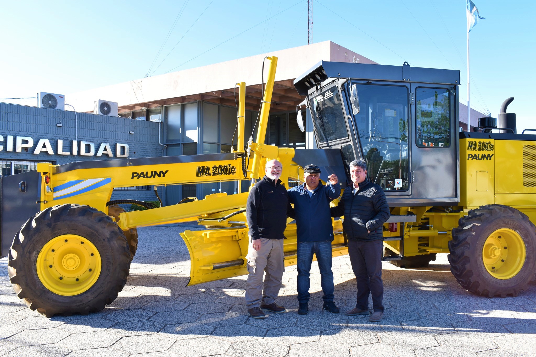 El Intendente Roberto Casari, acompañado del Ejecutivo Municipal, hizo entrega de las llaves de la nueva motoniveladora adquirida por la Municipalidad al Jefe del Corralón, José Luis Fistori, y al chofer de la maquinaria, Juan Funes.