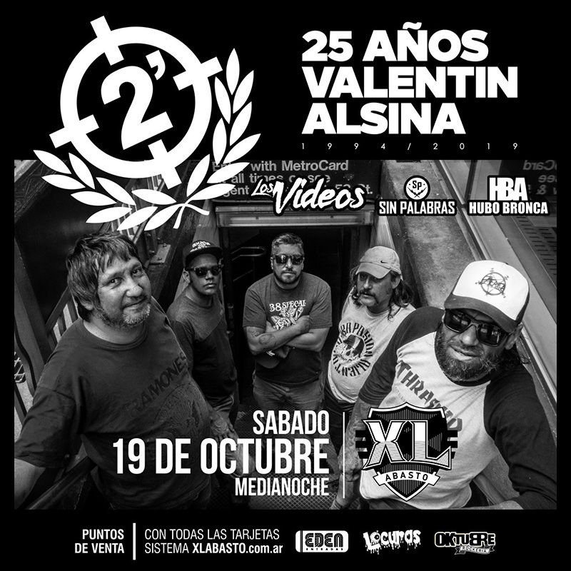 2 Minutos celebra los 25 años de “Valentin Alsina” en Córdoba, el próximo Sábado 19 de Octubre en XL Abasto (Blvd. Las Heras 124). También serán parte de la noche: Los Vídeos (Buenos Aires), Sin Palabras (Córdoba) y Hubo Bronca (Río Cuarto).
